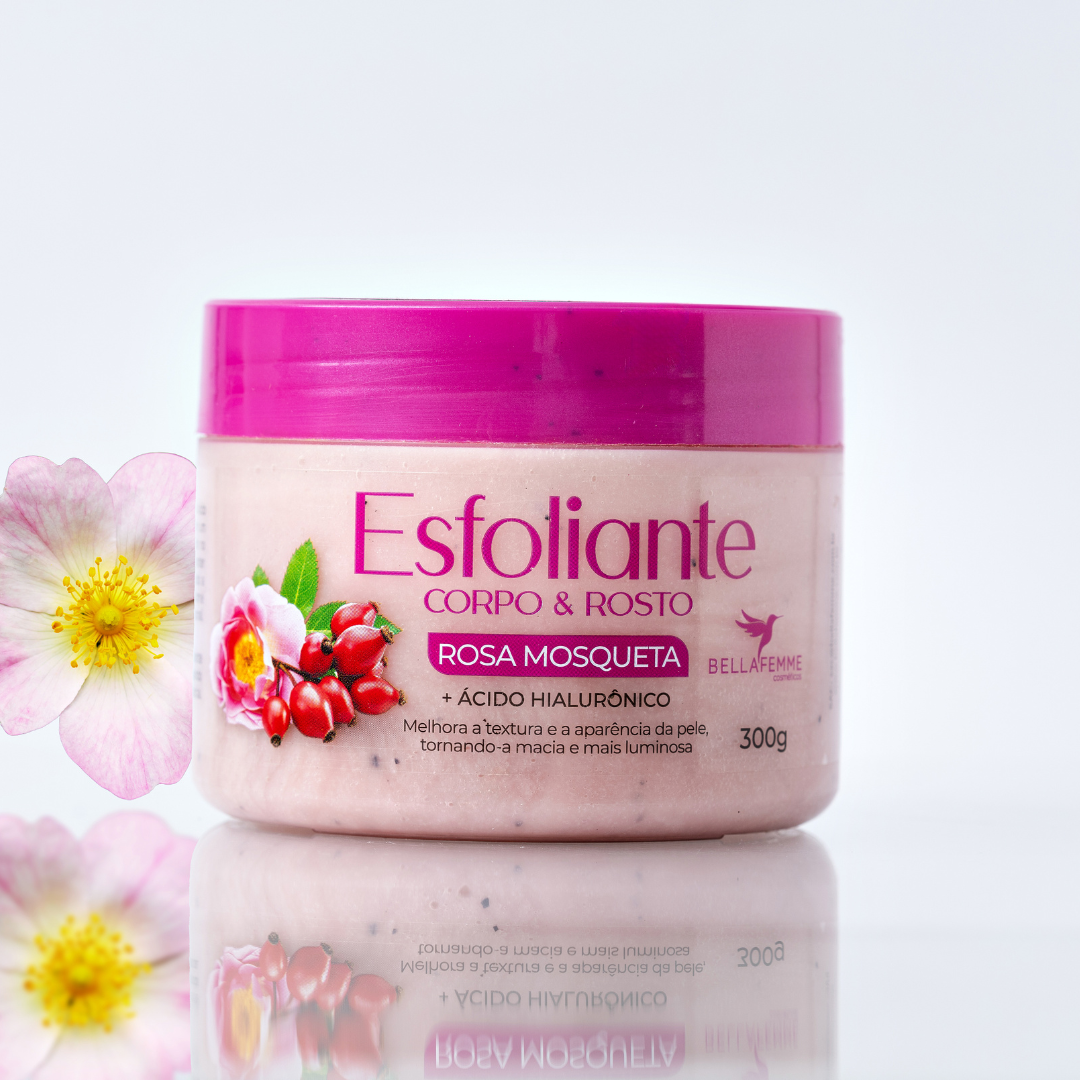 O Esfoliante Corpo & Rosto Rosa Mosqueta da Bella Femme alia cuidado e sofisticação. Enriquecido com ácido hialurônico e aroma floral, esfolia suavemente e promove hidratação, deixando a pele revitalizada e perfumada.
