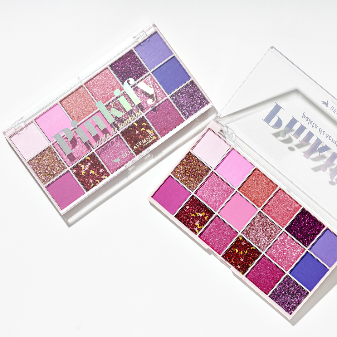 Com 18 tonalidades incrivelmente pigmentadas, a Paleta Pinkify é o verdadeiro "love in the air". São seis tons matte, seis cintilantes e seis glitterinados, oferecendo infinitas possibilidades para criar looks deslumbrantes e românticos. Cada cor foi escolhida para capturar a essência do romance, permitindo que sua imaginação voe alto e você mergulhe na magia do amor.